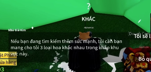 Gặp NPC Nhà Gỉa Kim nói chuyện và nó sẽ yêu cầu bạn tìm 3 bông hoa : xanh, đỏ, vàng.