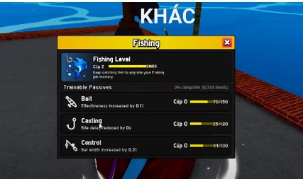 Bạn sẽ phải làm những nhiệm vụ liên quan đến “Bait” là mồi câu, “Casting” là lưỡi câu và “Control” là cần câu. Cứ mỗi lần bạn lên cấp thì những chỉ số này sẽ được tăng lên.