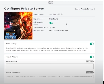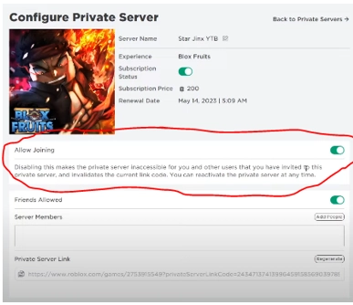 Tiếp theo khi bạn bật dòng “Allow joining” thì mọi người có link hoặc có kết bạn với bạn sẽ được vào Server Vip này chơi cùng bạn, còn nếu bạn không muốn thì chỉ cần tắt là được.