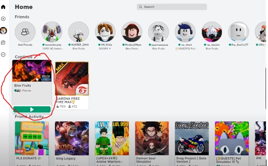 Đầu tiên, tại phần trang chủ của Roblox bạn ấn vào Blox Fruits.