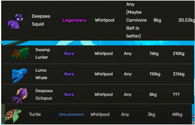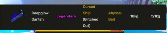 Con cá Deepglow Oarfish huyền thoại. Con cá huyền thoại mới này xuất hiện ở khu vực Chiếc thuyền bị nguyền rủa bên Sea 2. Tại đây các bạn di chuyển xuống phía bên dưới chiếc thuyền để câu cá.