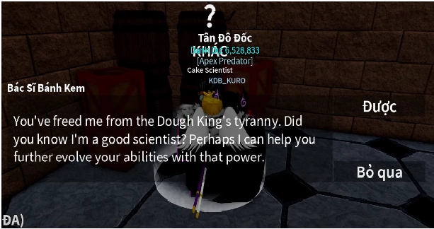 Dùng chìa khóa để mở cửa và đi vào gặp NPC Cake Scientist và nói chuyện với nó.