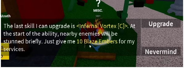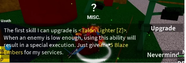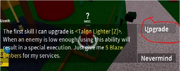 Sau khi nhặt đủ 5 Blaze Embers thì bạn quay ra chỗ NPC Uzoth và Upgrade chiêu Z nhé.