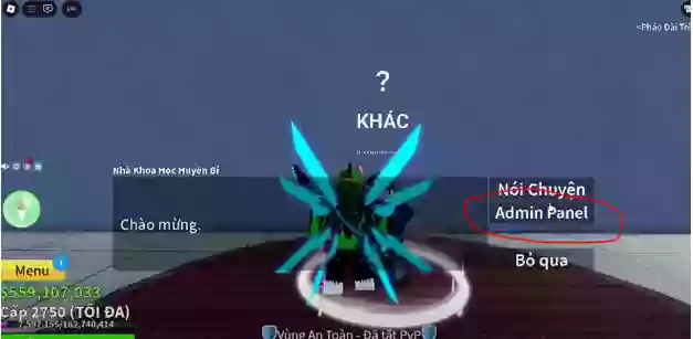 Tại Lâu Đài Trên Biển ở Sea 3 bạn gặp NPC Mysterious Scientist nói chuyện và chọn “ Admin Panel”.