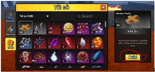 Và để chế tạo lọ thuốc này thì bạn ấn vào mục nguyên liệu “ván gỗ” sau đó chọn Build.