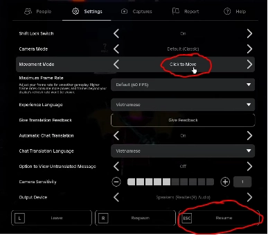 Sau khi đi vào đây thì bạn vào phần cài đặt mục Movement Mode chọn Click to Move và sau đó bấm Resume.