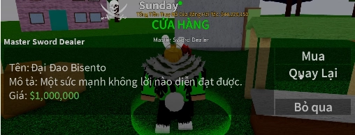 Đầu tiên tại Sea 1, bạn đến Đảo Trời và leo lên tầng thứ 4 gặp NPC Master Sword Dealer để mua Đại Đao Bisento.