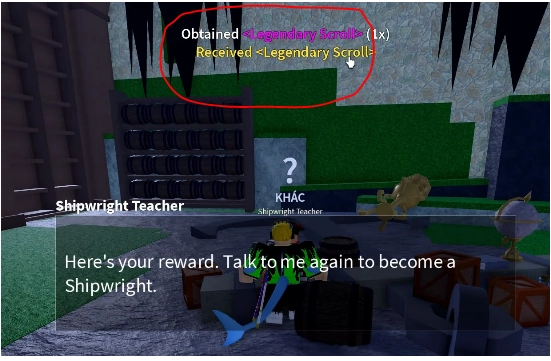 Sau khi farm đủ 20 con cá mập con bạn quay lại nói chuyện thì NPC sẽ cho bạn một cuộn giấy huyền thoại.