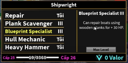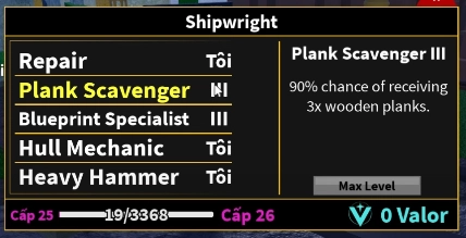 Ngoài ván gỗ, bạn cần thêm một nguyên liệu gọi là điểm Valor để nâng cấp kỹ năng mới . Để thu thập điểm valor thì bạn tham gia farm các sự kiện trên biển, bạn farm càng nhiều càng tốt.